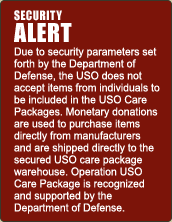 For further information on Operation USO Care Package, please e-mail questions@USOCarePackage.org.